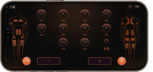 •身体部位调控:通过人体模型+部位按钮,精准调节肱二头肌、腹部等身体区域的电脉冲强度(百分比数值),实现局部/全身力量训练定制