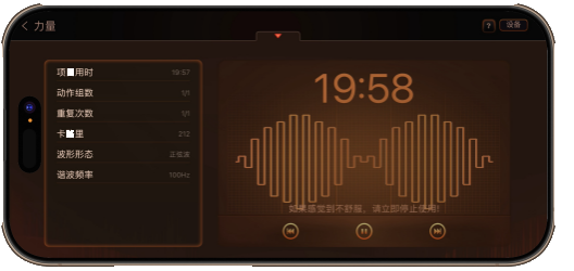 •训练监测:实时显示项目用时、动作组数、重复次数、卡路里消耗等数据,搭配波形、频率参数,让训练过程可视化
